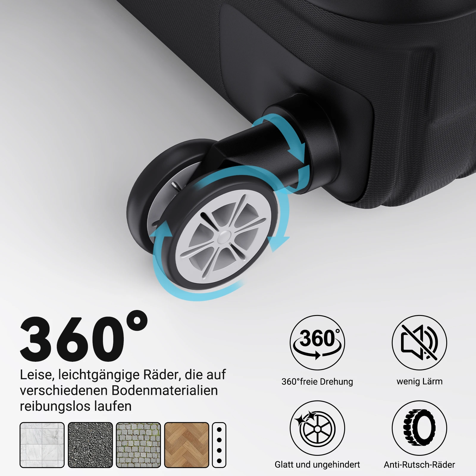 Convenience and safety:Secure your belongings with the integrated 3-digit combination lock, which is uncomplicated and easy to use. Four 360° dual spinner wheels offer unparalleled freedom of movement, allowing you to glide through airports and roads with minimal effort.